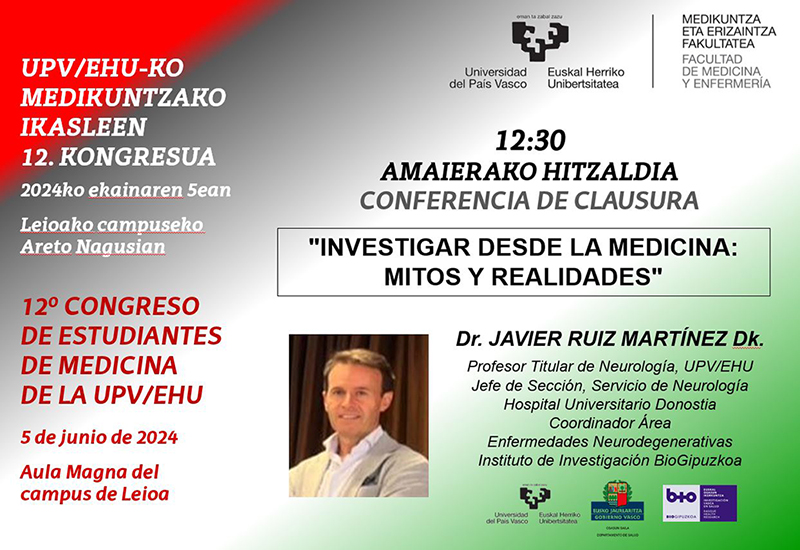 Medikuntza Graduko 3. mailako "Ikerketa Proiektua" irakasgaiarekin lotuta, ekainaren 5ean "UPV/EHUko Medikuntzako Ikasleen XXII Kongresukoa" izango dugu Leioako campuseko Areto Nagusian. Kongresu honi amaiera emateko MEFeko ikasle guztiontzat interesgarria izan daitekeen hitzaldia izango dugu 12:30etan . Hitzaldiaren izenburua: "Investigar desde la Medicina: Mitos y realidades" Hizlaria: Javier Ruiz Martínez Dk. UPV/EHUko Neurologiako Irakasle titularra, Donostia Unibertsitate-ospitaleko Neurologia Zerbitzuko Ataleko Nagusia eta Biogipuzkoa Ikerketa-Institutuko Neuroendekapenezko Gaixotasunen arloko Koordinatzailea.