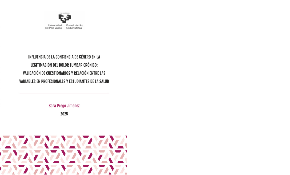 Sara Prego Jimenezen tesiaren defentsa, Influencia de la Conciencia de Género en la Legitimación del Dolor Lumbar Crónico: Validación de cuestionarios y relación entre las variables en profesionales y estudiantes de la salud izenburua duena eta Psikologia Klinikoa eta Osasunaren Psikologia eta Ikerketa Metodologia Saileko Jone Aliri eta Ainitze Labakaren zuzendaritzapean, datorren asteartean, ekainaren 17an, 15:00etan defendatuko dela Psikologia Fakultateko Gradu Aretoan.
