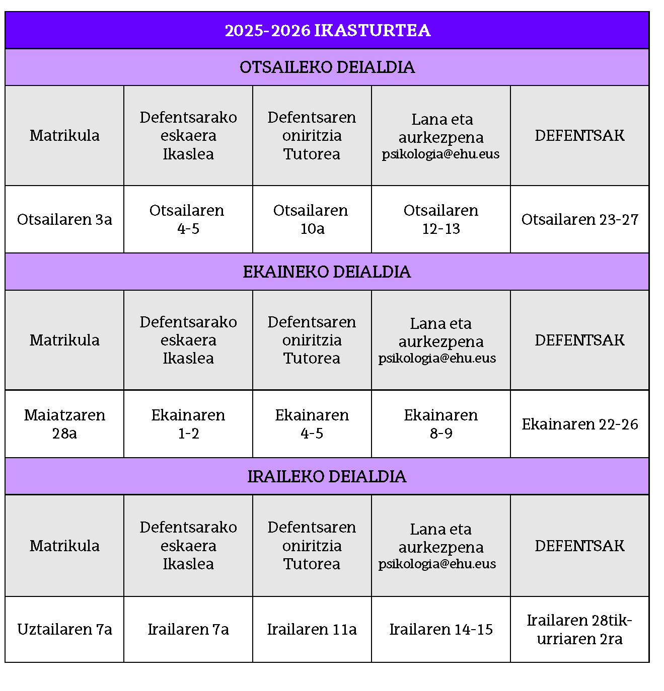 GrAL-a eta defentsaren aurkezpena (biak PDF-ean) psikologia@ehu.eus helbidera bidali behar dira, defentsen deialdi ofizialean ezarritako epean.