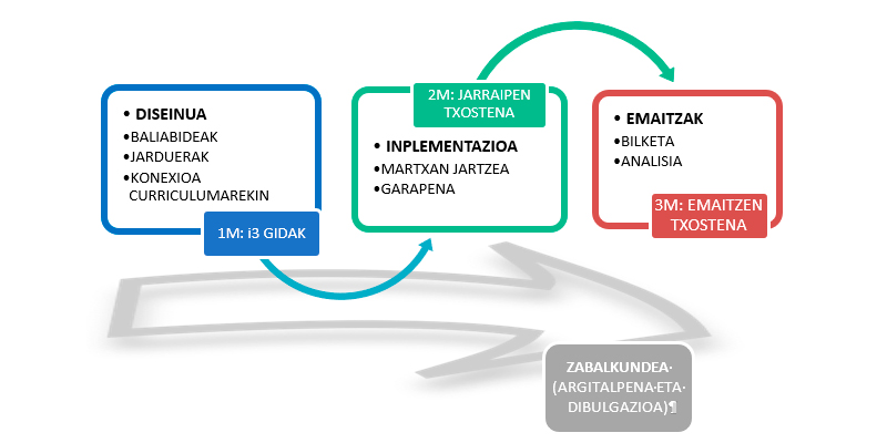 (1) Curriculum txertaketako ekintzak diseinatzeko eta planifikatzeko fasea. Fasea amaitzeko, i3 irakaskuntza gidak edo ikaslearen gidak idatziko dira; proiektuen lehen mugarria izango dira (1M). Txosten bat idatziko da, irakaskuntza edo ikaslearen gidetan eginiko aldaketak azalduta.