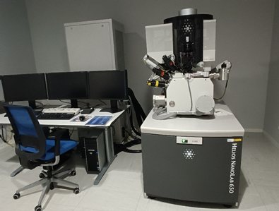 Deskribapena: FEI Helios NanoLab DualBeam 650 mikroskopio elektroniko ekorketa (SEM)/bideraturiko ioi sorta (FIB) lan estazio bat da, nanoanalisi aurreratua egiteko eta laginak prestatzeko gai dena. Gune bateko TEM lagin espezifikoetarako, FIB-SEMa elektroiei mintz gardenak sortzeko erabili ohi da, fokatutako galio-ioien sortak erabiliz. Gainera, Helios Nanolab 650 FIB-SEMek detektagailu ugari ditu, SEM irudien kalitate bikaina eskaintzeko gai direnak.