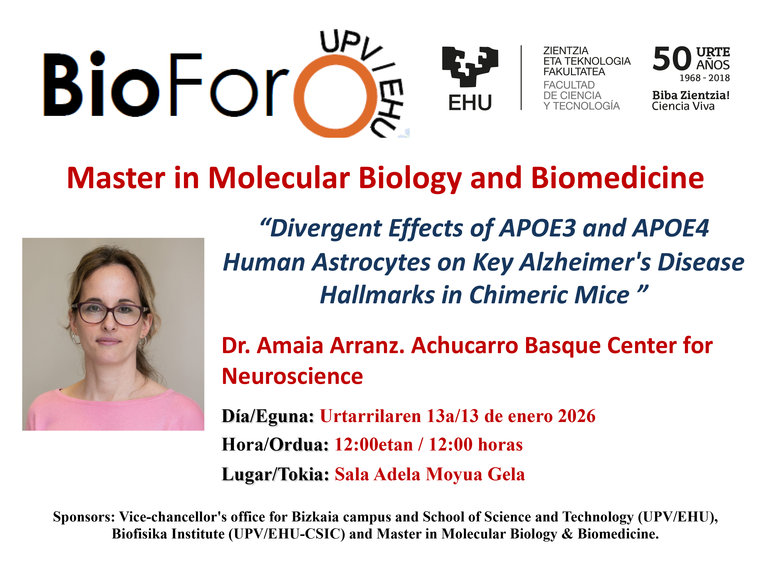 Sponsors: Vice-chancellor's office for Bizkaia campus and School of Science and Technology (UPV/EHU), Biofisika Institute (UPV/EHU-CSIC) and Master in Molecular Biology & Biomedicine.