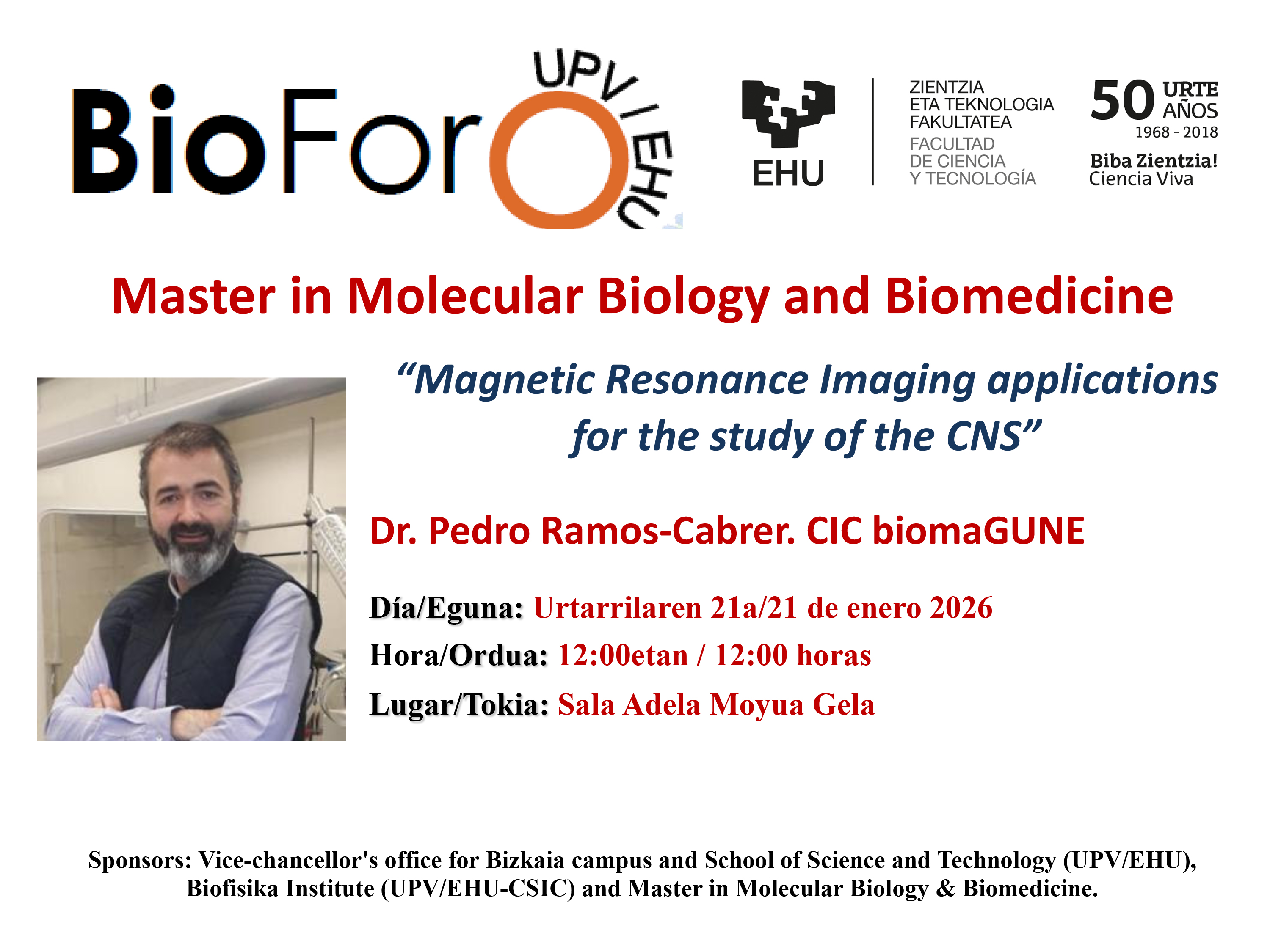 Sponsors: Vice-chancellor's office for Bizkaia campus and School of Science and Technology (UPV/EHU), Biofisika Institute (UPV/EHU-CSIC) and Master in Molecular Biology & Biomedicine.