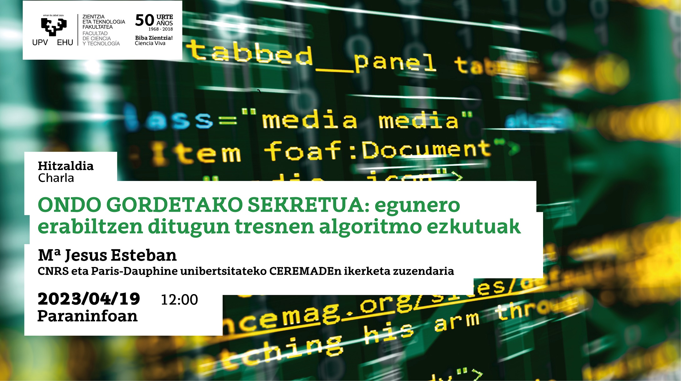 Hurrengo asteazkenean, apirilaren 19an, Maria Jesus Esteban doktoreak, Frantziako CNRS-ko ikertzaile emeritoak, “ONDO GORDETAKO SEKRETUA: egunero erabiltzen ditugun tresnen algoritmo ezkutuak” hitzaldia emango duela.