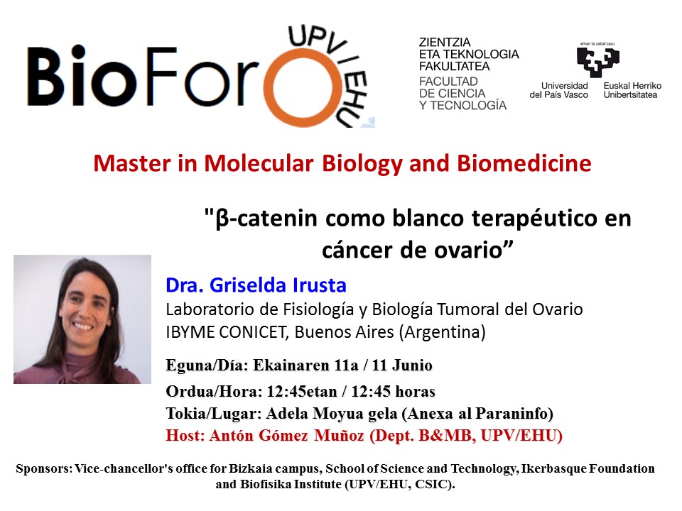 BioForo eta Master in Molecular Biology and Biomedicine “β-catenin como blanco terapéutico en cáncer de ovario” Dra. Griselda Irusta (Laboratorio de Fisiología y Biología Tumoral del Ovario IBYME CONICET, Buenos Aires-Argentina).