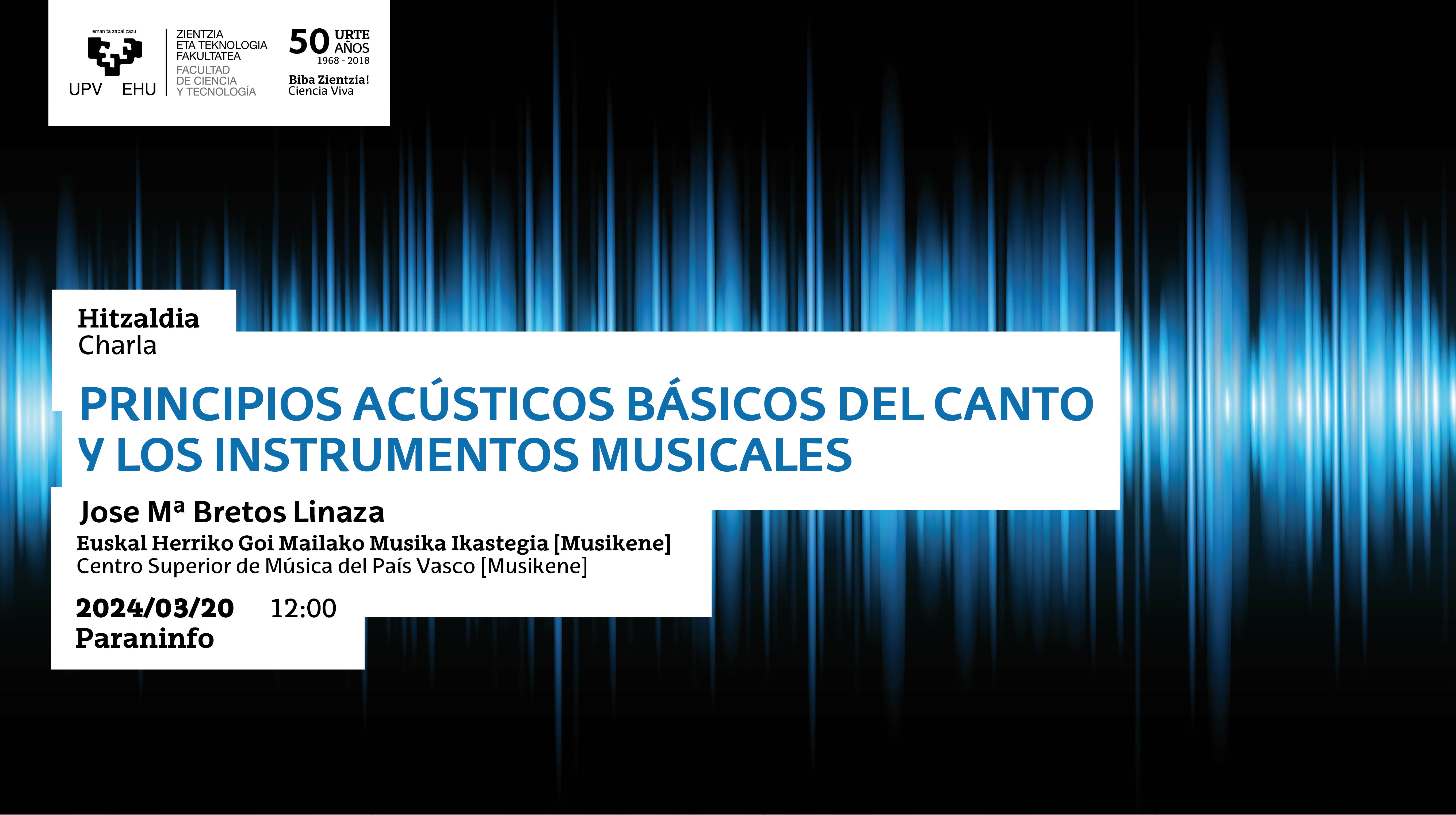 Kantuak eta musika-tresnek lilura berezia piztu dute gizakiarengan antzinatik. Soinuak igortzeko zuen gaitasuna magikotzat jotzen zen, eta, era berean, espekulazio fisikoa eta matematikoa bultzatu zuen, eta horren froga da K.a. VI mendearen ostean Pitagorasen Eskolak sakonki eztabaidatu izanak, Hitzaldi honetan, kantuaren eta musika-tresnen familien funtzionamendu akustikoari buruzko ildo orokor batzuk deskribatuko dira: soka, haizea eta perkusioa. Espektroak edo espektrogramak abiapuntu hartuta, maiztasun-analisi baten bidez erraz azter daitezkeen adibide batzuk xehetasun handiagoz azalduko dira. Domeinu libreko audio-softwarearen utilitateak erabiliko dira, interesa duen ikusleak erraz erreproduzitu ahal izan dezan konferentzian azaldutakoa.