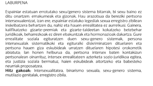 Datorren astelehenean Leioan UniDibertsitate Eguna ospatuko da, zeinaren baitan Gradu Amaierako Lan (GrAL) eta Master Amaierako Lanetan (2022-23 Ikasturtea) LGTBI ikuspuntuaren inklusibitateari Empar Pineda Saria emango zaion gure Fakultateko Bizkaiko Zuzenbide Graduko ikasle den Arrate Gorrotxategi Lópezi, “Las realidades silenciadas de las personas intersex: discriminaciones y vulneraciones de derecho consentidas por la legislación, enmarcado en la labor de nuestra Clínica Jurídica por la Justicia Social” lanagatik. Tutoreak: Alazne Irigoyen Domínguez eta Oscar Arroyuelo Suárez.