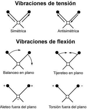 flexión. Las vibraciones de tensión son cambios en la distancia interatómica