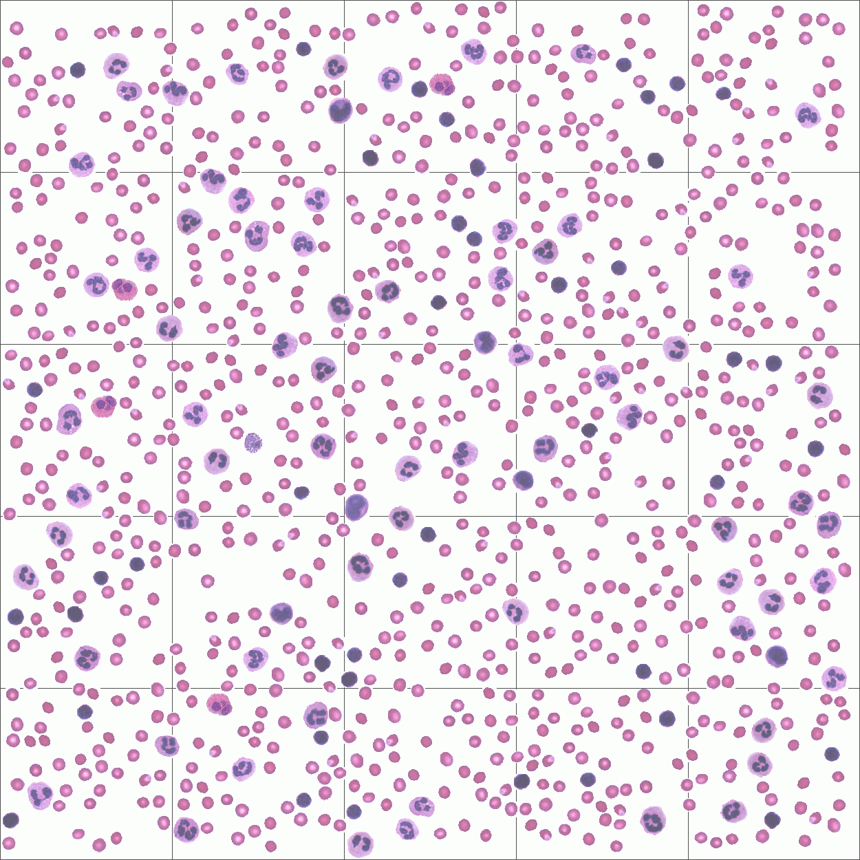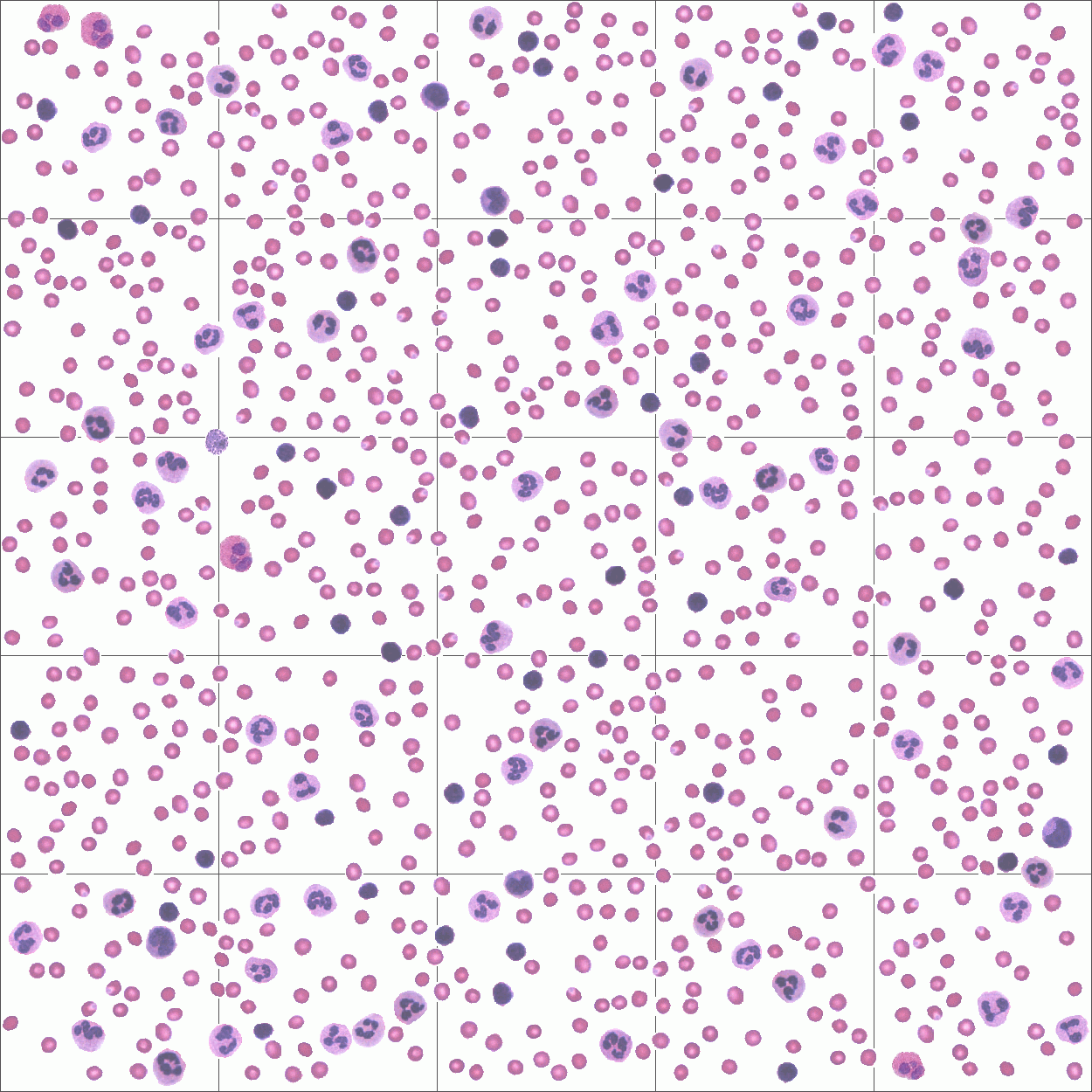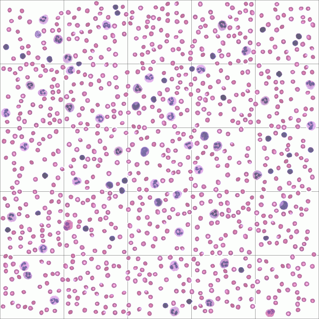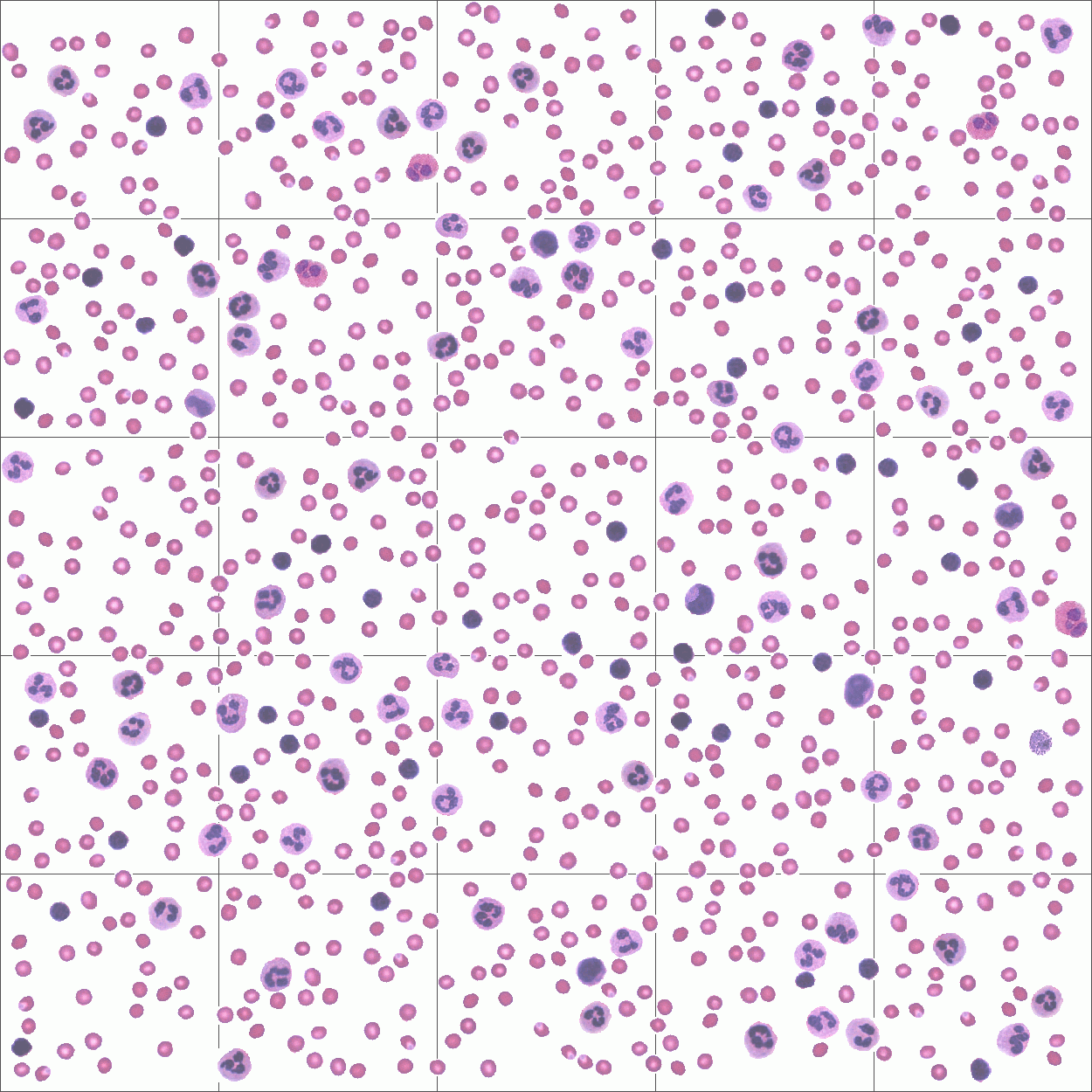 tipo de células con diferente tamaño y fenotipo: basófilos, eosinófilos, neutrófilos, linfocitos y monocitos.