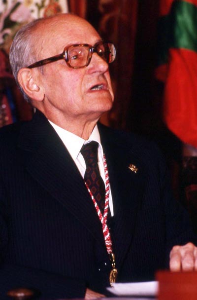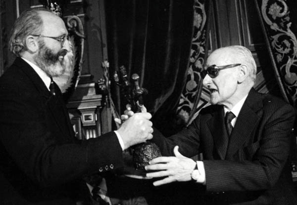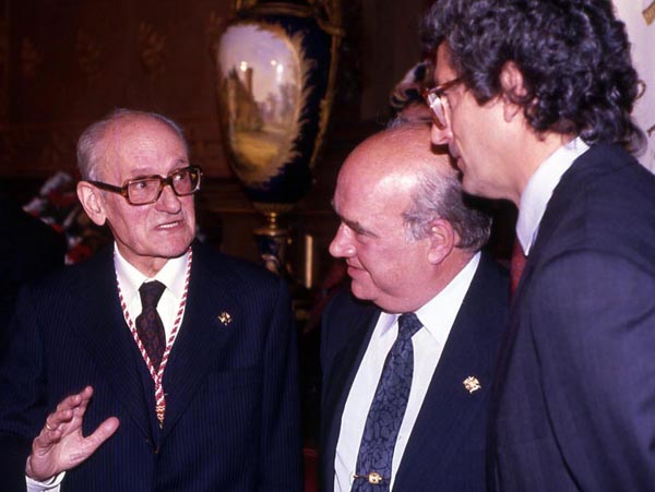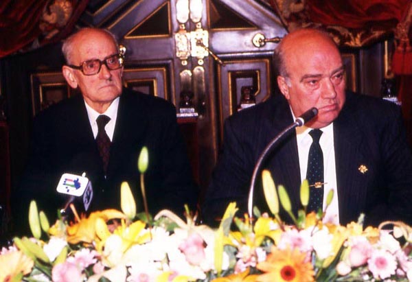 Karlos Santamaria Gipuzkoako Urrezko Domina emate-ekitaldian (1991-04-27). Eskuinean, Imanol Murua, Gipuzkoako Ahaldun Nagusia.