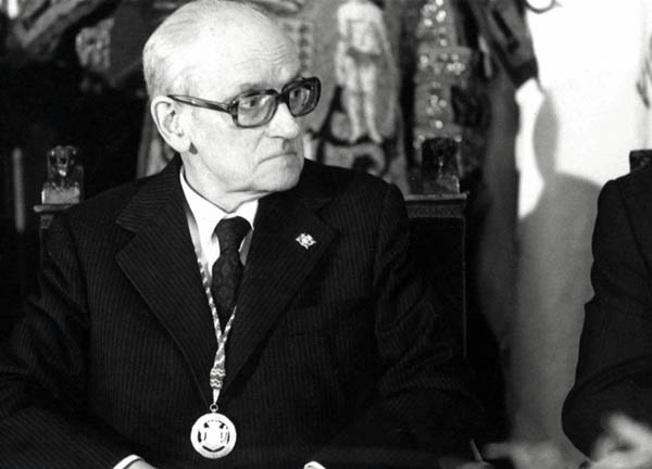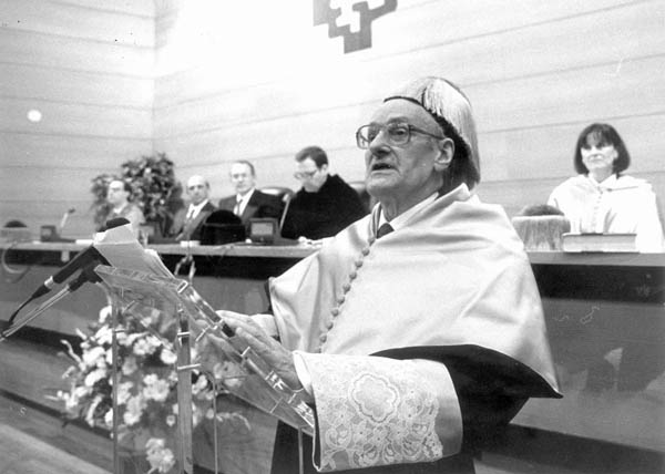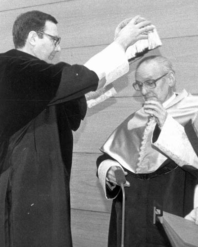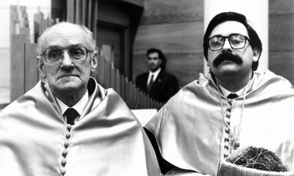 Karlos Santamaria UPV/EHUren Honoris Causa Doktore izendapen-ekitaldian (1992-02-05). Eskuinean, Jesus Maria Larrazabal.