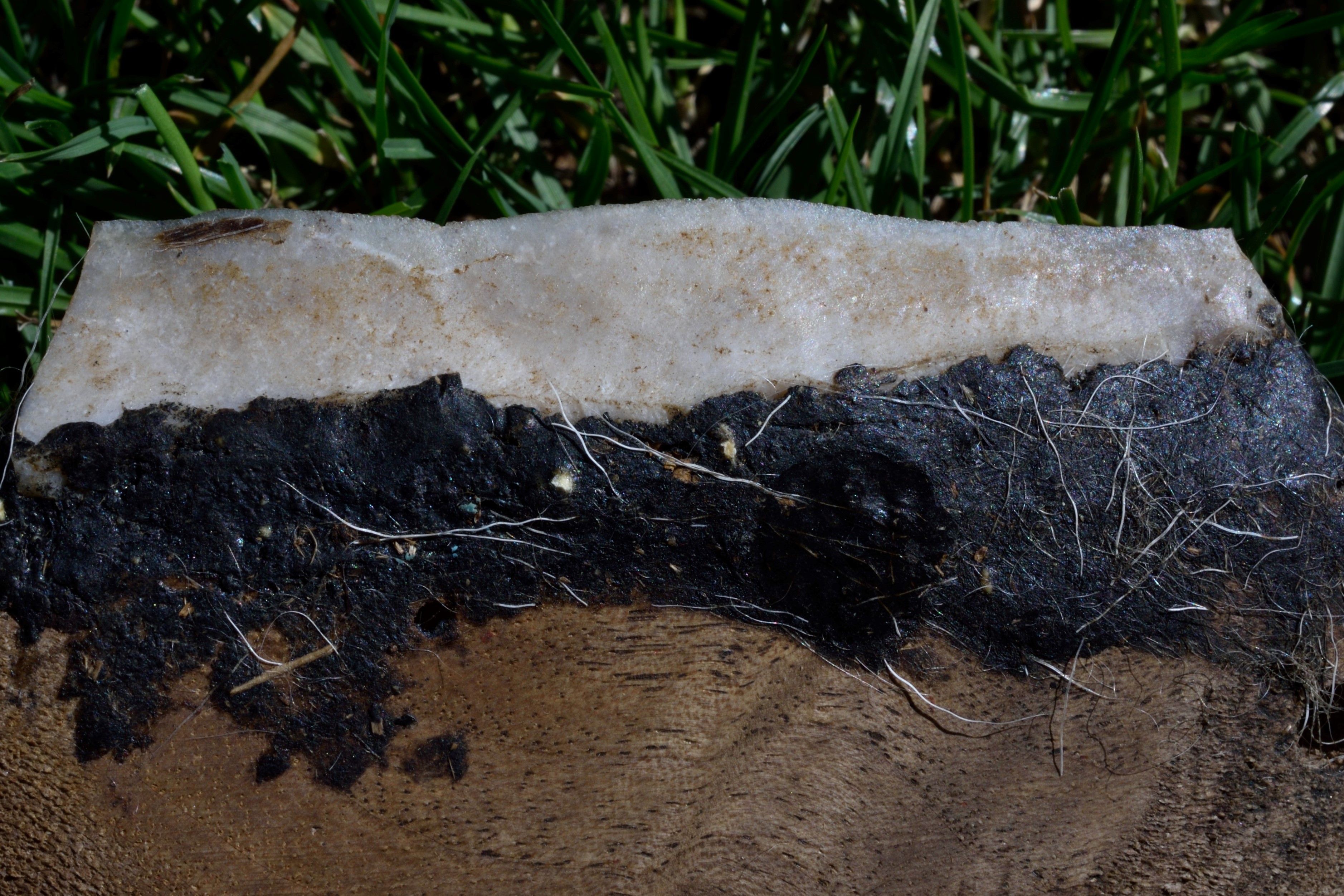 En las fotos aparece el instrumento utilizado para esquilar las ovejas: han sujetado el sílex con un soporte de madera, utilizando pegamento. Una vez esquilada la oveja, aparece la lanolina degradada que permanece en el sílex. Autor: Josep Maria Vergès Bosch (IPHES). -
