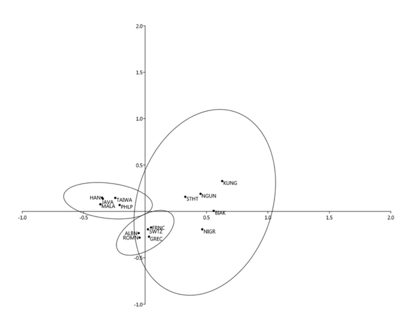 del mismo grupo en la superficie definida por la elipse. Quedan claramente separados los tres grupos poblacionales. Africa muestra más heterogeneidad que Europa y el Este de Asia.